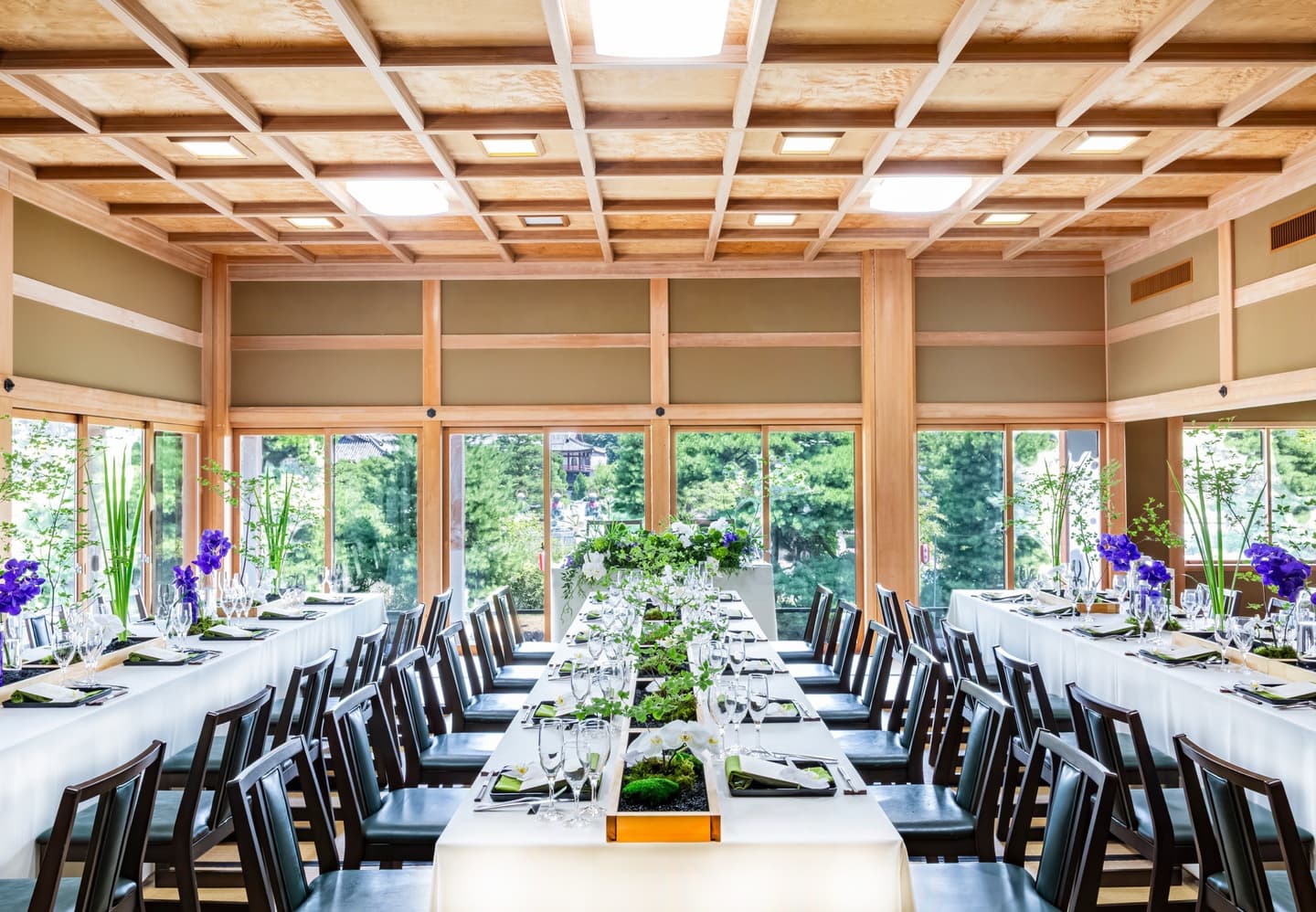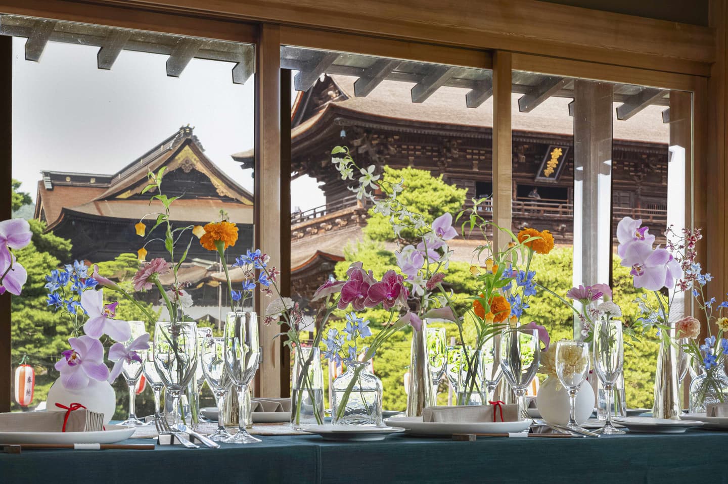 大勧進境内に佇む会場「紫雲閣」。窓に囲まれ善光寺本堂を望むことが出来る茶室や150畳の大広間と、ゲストの人数に合わせてご案内が可能です。
