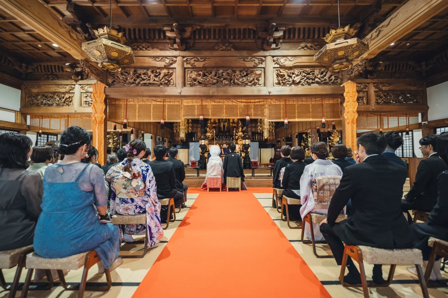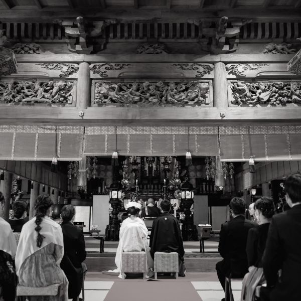 厳かな大勧進での挙式はゲスト全員の記憶に刻まれます。ご先祖様への報告も兼かねて、ご縁に感謝し、おふたりの絆を結ぶ、本当に心に響く挙式です。