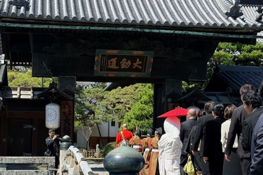 ゲストとともに歩む「参進の儀」は、雅楽の音色が響き渡る中、大勧進の橋を渡り、大門から本堂へと続きます。両家がひとつになる瞬間がここに・・・